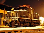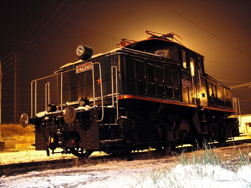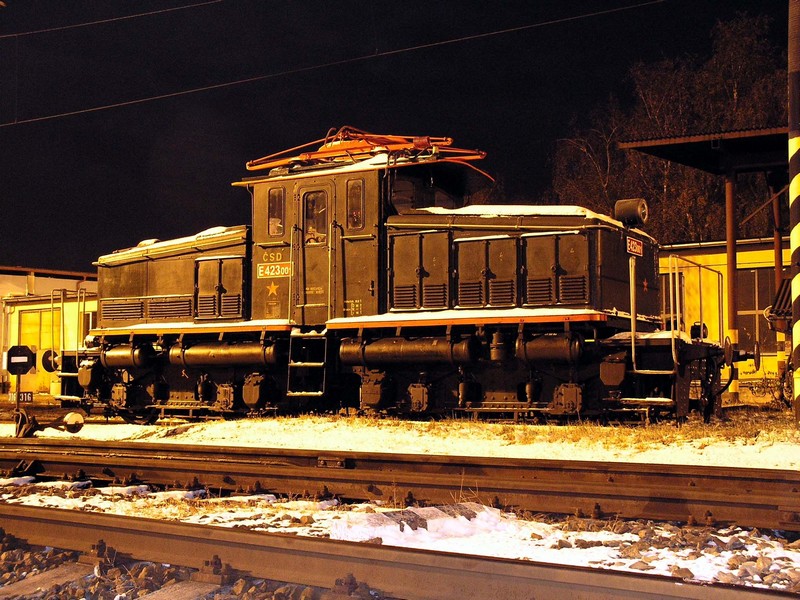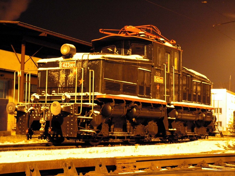 Do 3. listopadu 2006 odpočívala lokomotiva E 423.001 v remíze ve Vyšším Brodě. V noci byla převezena do Českých Budějovic (viz foto), odkud po dvoudenním stání odjela do Tábora a pak do své nové domoviny v Chomutově (foto Josef Rákos)