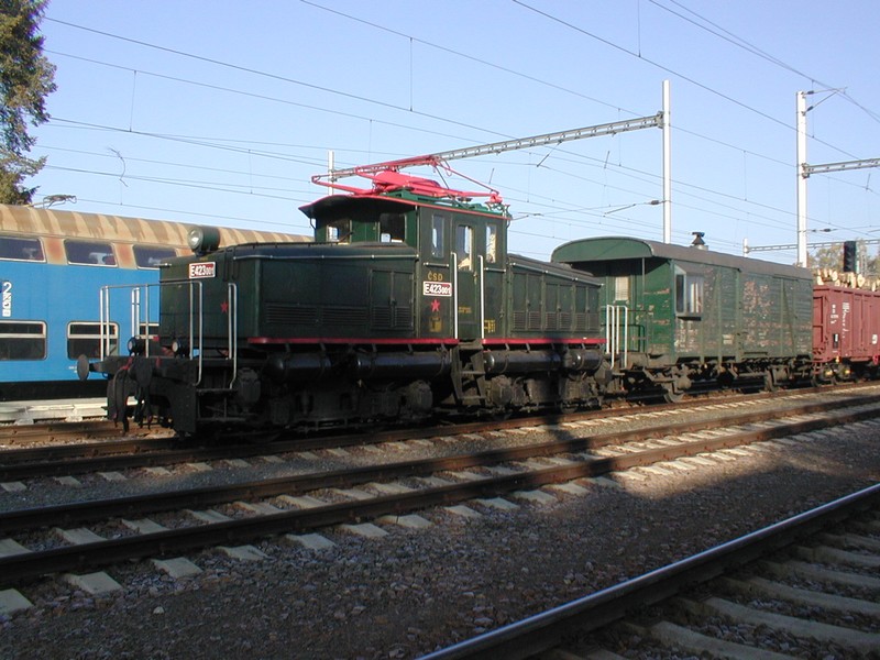 E 423.001 dne 17. října 2003 s manipulačním vlakem ve stanici Rybník (foto Luboš Klečatský)