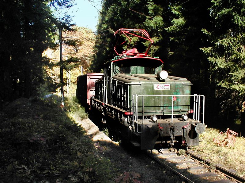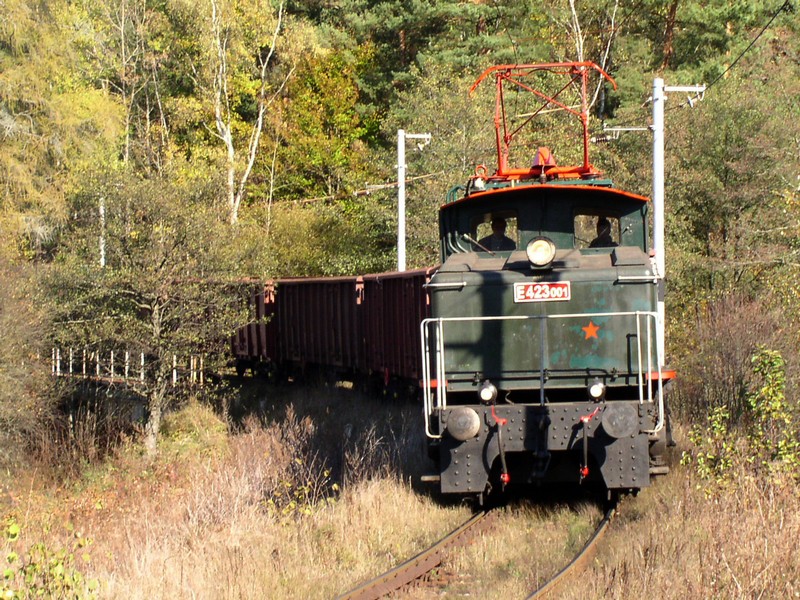 E 423.001 s nákladním vlakem projíždí traťový úsek Vyšší Brod klášter - Čertova Stěna při rozloučení s provozem pod 1500 V ss dne 17. října 2003 (foto Jan Kubeš)