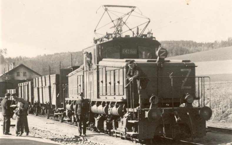 E 423.002 s nákladním vlakem ve stanici Vyšší Brod klášter někdy v 50. letech, kdy sem byla zapůjčena jako výpomoc během stavby lipenské přehrady (foto archiv Luboš Klečatský)