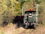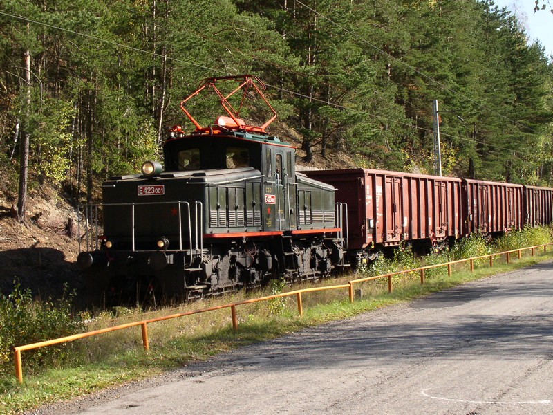E 423.001 byla dne 17. října 2003 mimořádně nasazena na vozbu manipulačních vlaků na trati Rybník - Lipno nad Vltavou, snímek ji zachytil během pobytu ve stanici Vyšší Brod klášter (foto Luboš Klečatský)