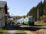Den rozloučení stejnosměrných lokomotiv s tratí Rybník - Lipno nad Vltavou: táborská muzejní lokomotiva 100.001 na osobním vlaku ve stanici Loučovice 17. října 2003 (foto Luboš Klečatský)