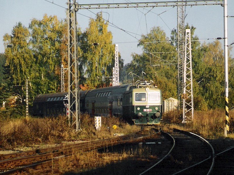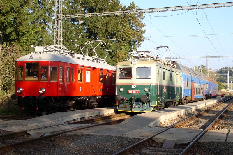 Setkání "bobinky" 100.001 s "Elinkou" EM 400.001 ve stanici Rybník 17. října 2003 (foto Jan Kubeš)