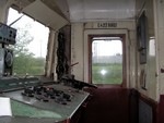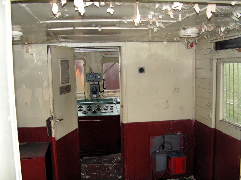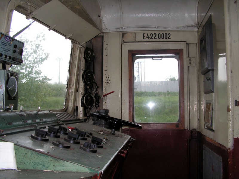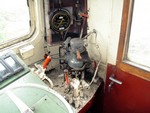 pohled na stanoviště strojvedoucího 100.002: zcela vlevo vysílačka a registrační rychloměr, uprostřed na sloupku