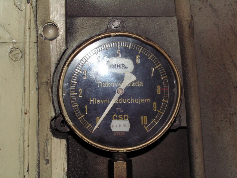 ukazatel tlaku hlavního vzduchojemu tlakové brzdy na prvním stanovišti 100.002 (foto Josef Rákos)