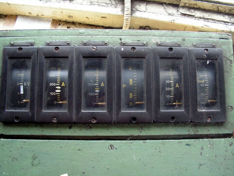 ukazatelé na prvním stanovišti 100.002 (zleva): napětí v troleji, proud ve skupině motorů I, proud ve skupině