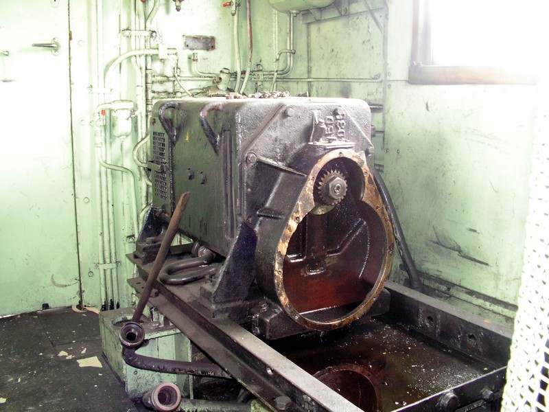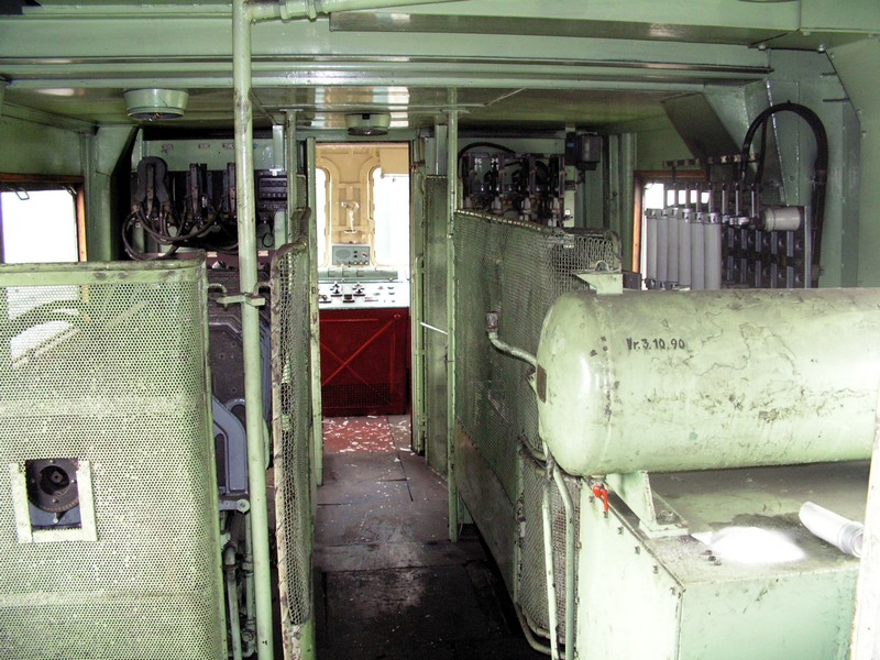 pohled do strojovny od zavazadlového oddílu: vpravo nahoře vzduchojem (přístrojová jímka), za nimi